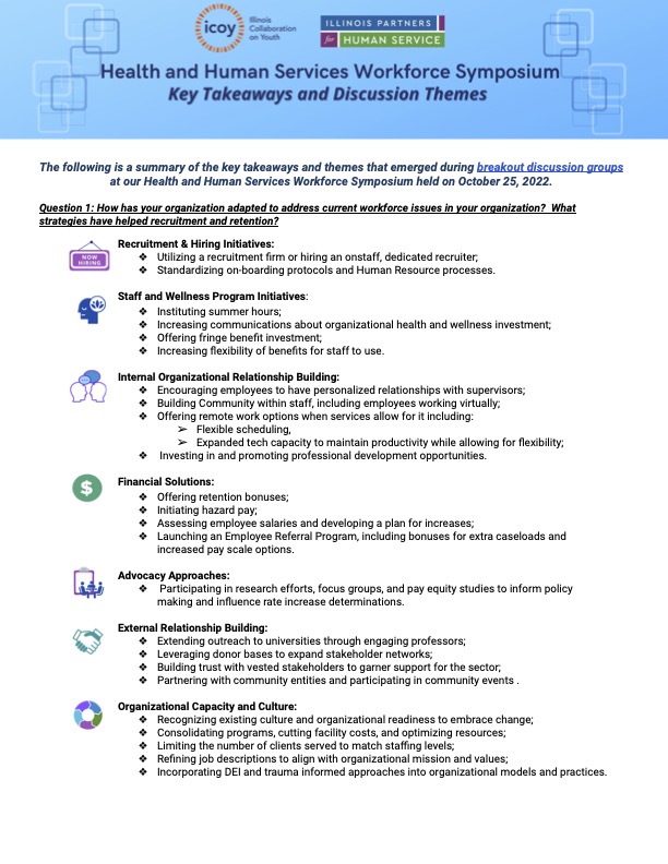 ICOY and Illinois Partner for Human Services co-hosted a hybrid Inaugural Health and Human Services Symposium in October. This event was well attended by health and human services professionals from all across Illinois. Break out rooms were hosted for both in-person and online participants. You can find the themes of innovative ideas below: