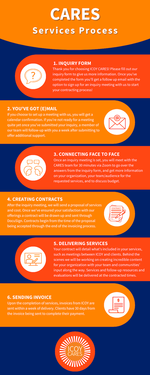 CARES is part of ICOY’s comprehensive range of services, distinguished by its unique focus on Collaborative Approaches to Resilience, Education, and Support. CARES is specifically designed around trauma-informed principles and frameworks. These principles not only shape CARES’s strategies, but also guide its approach to forming partnerships, conducting trainings, and enhancing capacity building services. This distinctive emphasis ensures that CARES not only supports but empowers individuals and organizations through a deeply informed and empathetic approach.